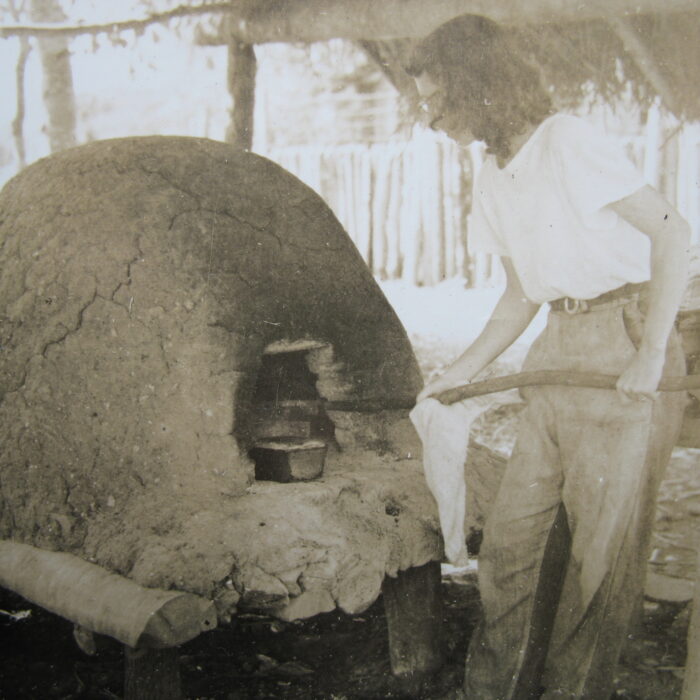 Aleksandrs Ziemeļs’s wife, Edīte (Edith Louise Bray Siemel), stands by a bread oven built from an anthill.
